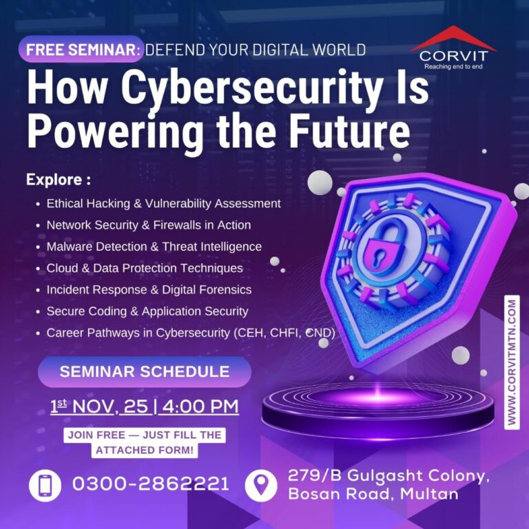 AI & Cyber Security Free Seminar at Corvit Multan AI is the New Gold Rush! FREE Seminar — Learn How to Cash In! Ready to Kickstart Your AI Journey? 🚀 Join us for a FREE SEMINAR and discover how Artificial…